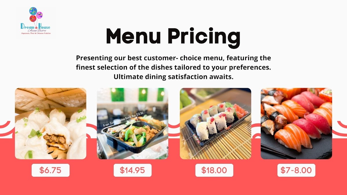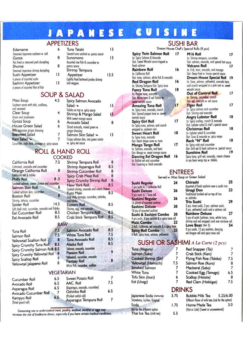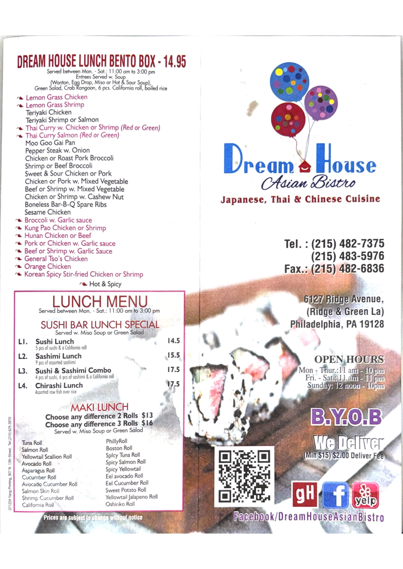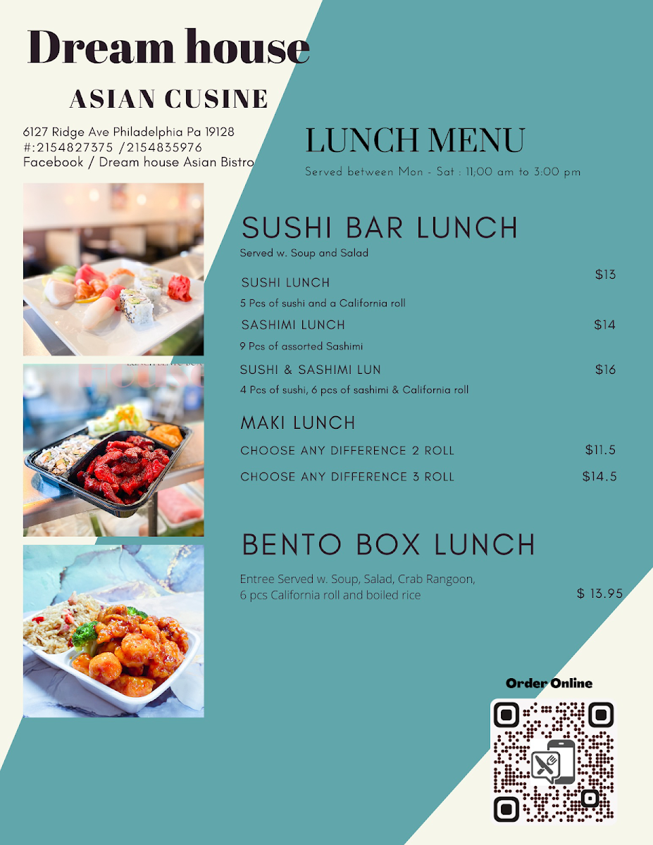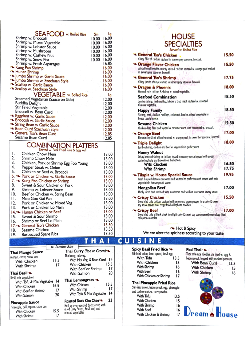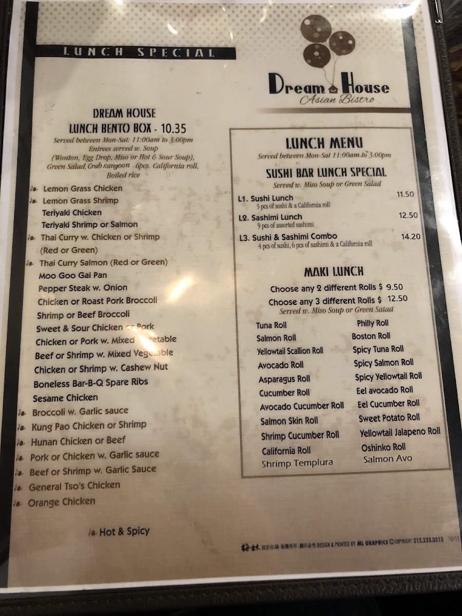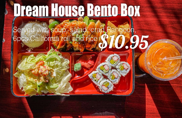 Dream House Asian Bistro offers a diverse and flavorful menu that blends various Asian cuisines, from sushi to traditional Chinese, Thai, and Korean dishes. For lunch, their Bento Boxes are a popular choice, offering options like Lemon Grass Chicken or Teriyaki Salmon. If you're in the mood for sushi, their Sushi Bar Lunch Specials feature selections such as Sushi Lunch or Sashimi Lunch, perfect for those who crave fresh, high-quality fish. The Maki Lunch allows you to choose from rolls like the Tuna Roll or Yellowtail Scallion Roll, while the Roll & Hand Roll section offers both cooked and raw options, such as the California Roll or the Spicy Crunchy Tuna Roll. For appetizers, options like Edamame and Gyoza pair well with the house's signature soups, including Miso Soup and Clear Soup. The House Specialties menu presents standouts like General Tso's Chicken and Dragon & Phoenix, offering a satisfying balance of flavors. If you're in the mood for something from the Thai side, the Thai Cuisine section serves up dishes like Thai Basil with Chicken and Thai Mango Sauce with Shrimp. The variety extends to combination platters, fried rice, and lo mein, offering plenty of hearty choices such as Shrimp Fried Rice and Chicken Lo Mein. Lastly, the Korean Cuisine offerings, including Korean Chicken and Korean Beef, provide a unique twist on traditional flavors. Whether you're in the mood for sushi, stir fry, or comfort food, Dream House Asian Bistro ensures there's something for everyone to enjoy.
